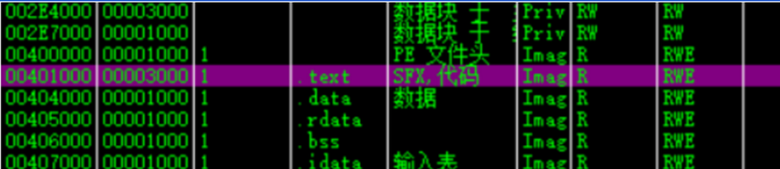 假设虚拟地址VA为00401518,要想知道相对偏移RVA,就要知道00401528属于那个节区,点M查看,是.text 也就是代码区,从00401000开始的,即RVA=00401518-00401000=518