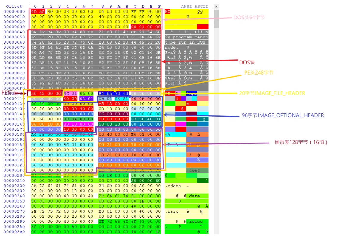 可选头的成员比较多,以可选头起始位置为基准,使用偏移量(十六进制)来描述重要成员。