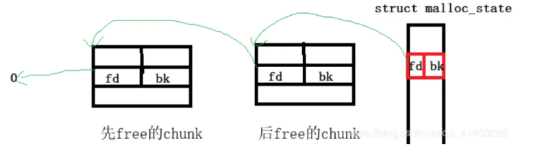 fastbins的存储采用后进先出(LIFO)的原则:后free的chunk会被添加到先free的chunk的后面。同理,通过malloc取出chunk时是先去取最新放进去的因此,fastbins中的所有chunk的bk是没有用到的,因为是单链表。并且fastbins比较特殊,一个fastbin链第一个chunk指向于一个特殊的“0”,然后后面接的是后free的chunk……以此类推,最后一个chunk再由arena的malloc_state的fastbinsY数组所管理