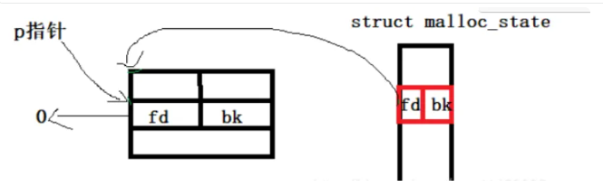 步骤二:释放之后,arena管理的fastbin中bin头的fd指针指向于我们申请的这个chunk,p指针就是chunk的fd,如上所示