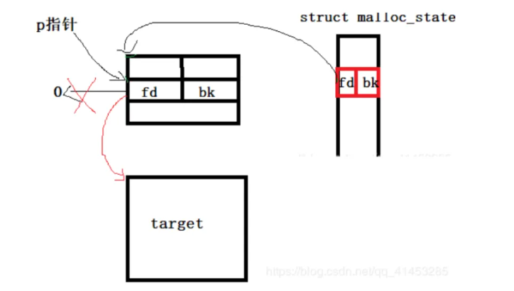 步骤三:这个chunk的fd指针本来指向于数值0,此时我们通过p指针将fd指针指向于我们的target地址