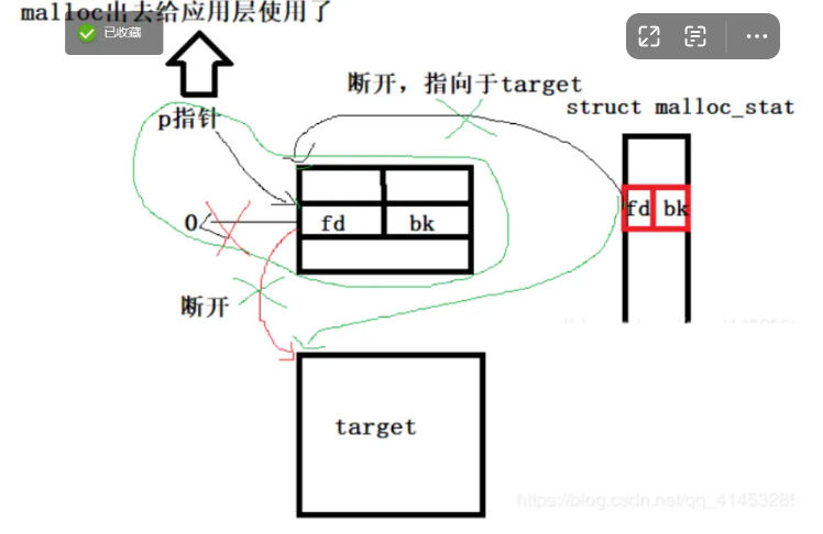 步骤四:malloc与我们释放的chunk相等大小的chunk,那么被上面被free掉的chunk就会从fastbin单链表中移除,根据fastbin链表的单链表结构,此时arena的fastbin的bin头的fd指针指向于我们的target地址了