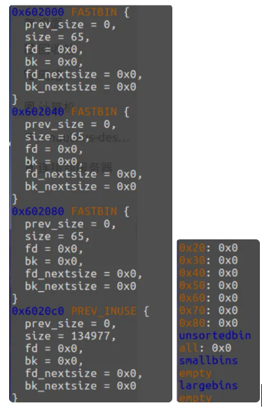 fastbin使用单链表维护释放的堆块,由 fastbin 管理的 chunk 即使被释放,但next_chunk 的 prev_inuse 位也不会被清空