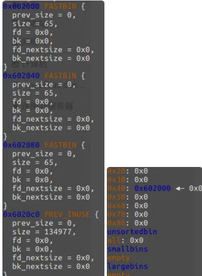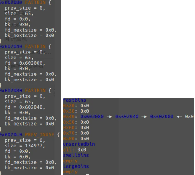 chunk3的fd指向chunk2,chunk2的fd指向chunk1,chunk1做为fastbin链的第一个指向特殊的“0”